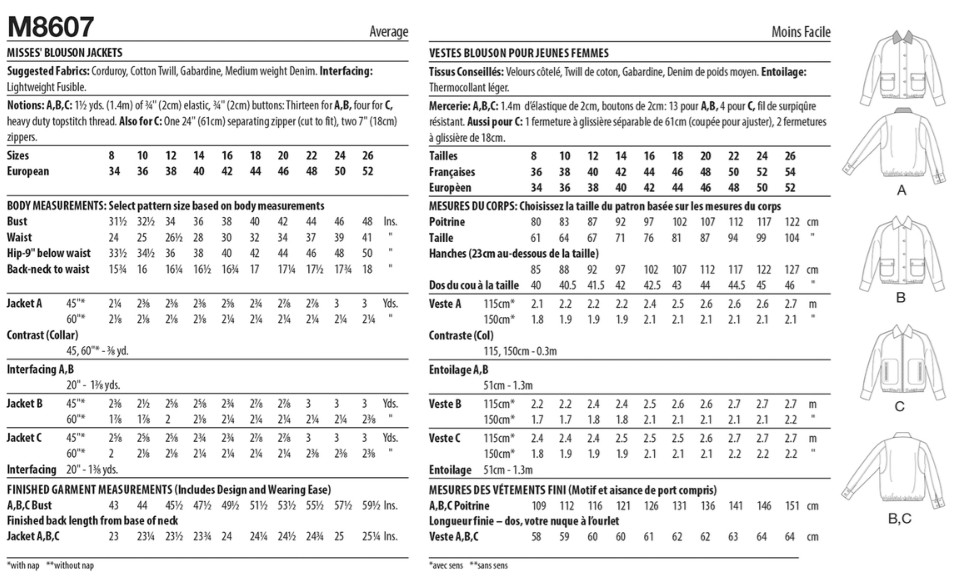 Fabric Suggestions: Corduroy, Cotton Twill, Gabardine, Medium weight Denim. Interfacing: Lightweight Fusible.