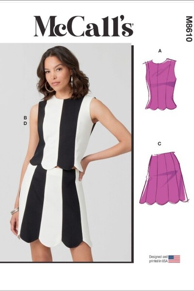 Sleeveless knit top and skirt pattern have scalloped hem and invisible zipper closure. Views B and D have contrast panels.