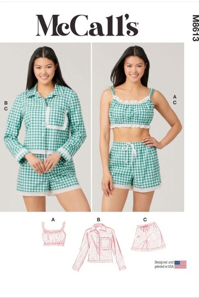 Bralette sewing pattern has ruffle shoulder straps and elastics at neckline and hem. Button front shirt has collar, long sleeves with cuffs and chest pocket. Shorts have elastic at waist and purchased ribbon ties. All views have purchased scalloped eyelet trim.