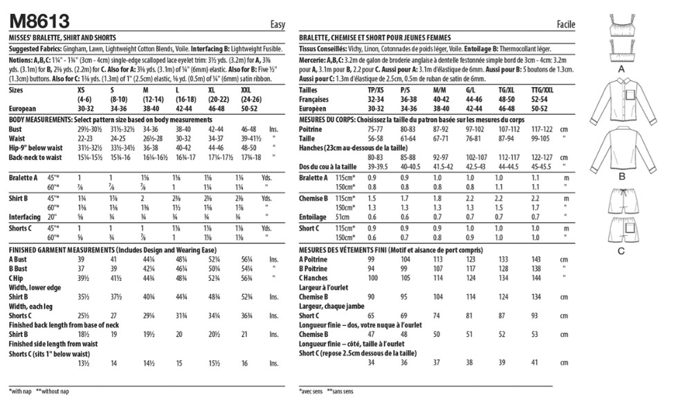 Fabric Suggestions: Gingham, Lawn, Lightweight Cotton Blends, Voile. Interfacing B: Lightweight Fusible.