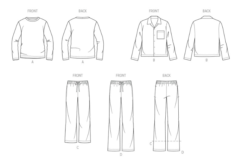 Crew top and button front shirt pattern have dropped shoulders and double stitching at hems. Pull-on pants in two lengths have elasticized waist, front ties and side seam pockets.