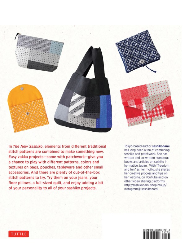 Prolific embroiderer, quilter and author sashikonami combines her love of sashiko with her fondness for piecework to create a whole new style of sashiko stitches and applications. Some of these patchworks give you a chance to play with patterns, colors and textures to create strikingly original bags, pouches, tableware and accessories.